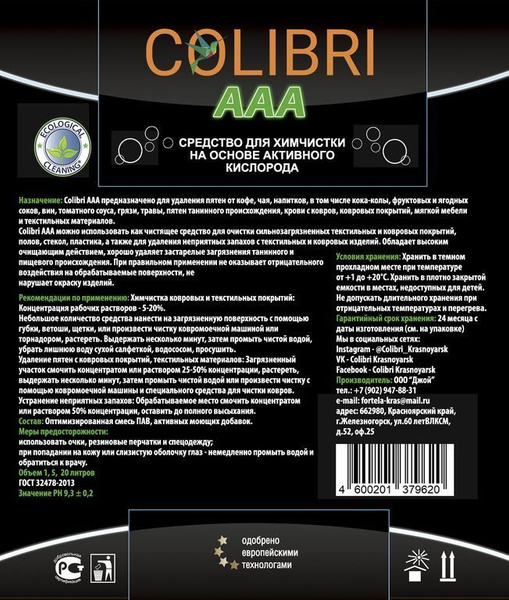 Colibri AAA – концентрированное нейтральное средство для химчистки сильнозагрязнённых ковровых и текстильных покрытий на основе активного кислорода. Используют также для очистки полов, стекла, пластика и для удаления неприятных запахов с ковровых и текстильных изделий.