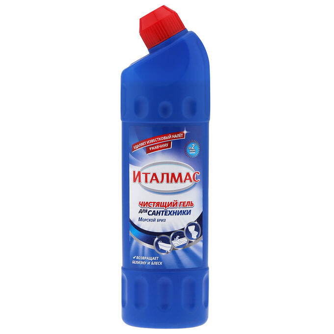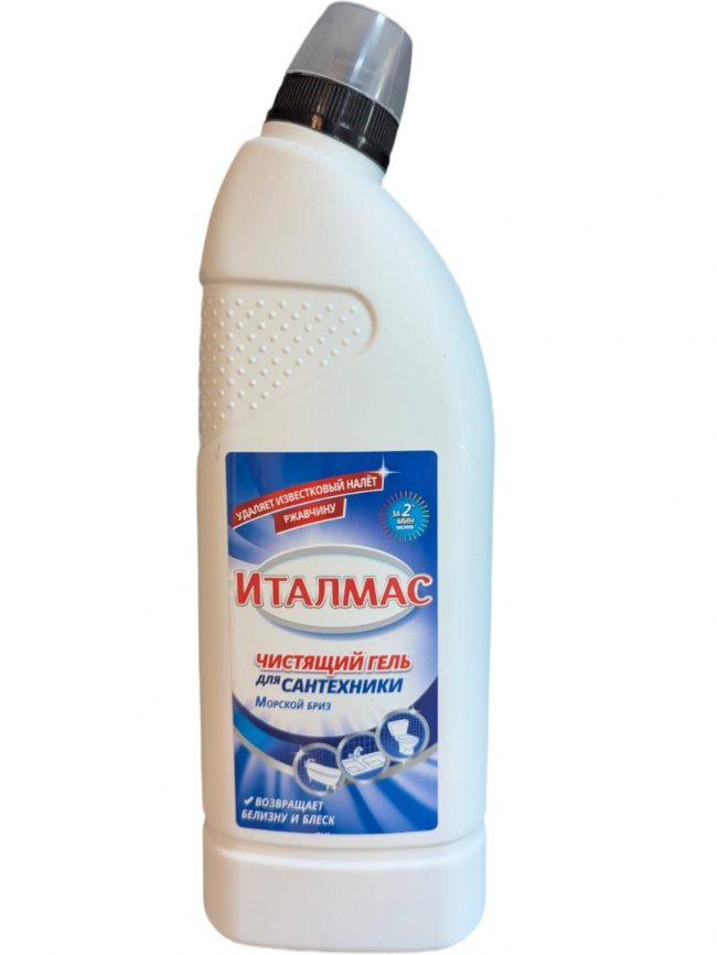 Италмас МОРСКОЙ БРИЗ – гелеобразное кислотное низкопенное средство для ежедневной ручной чистки сантехники и уборки стен и полов в гигиенических зонах. Гель удерживается на вертикальных и наклонных поверхностях, помогает удалять мочевой камень, известковый налёт, ржавчину, водный камень и мыльные осадки, хорошо смывается водой и не содержит хлора.
