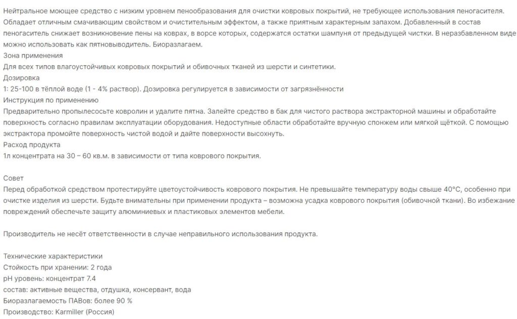 Нейтральное моющее средство с низким уровнем пенообразования для очистки ковровых покрытий, не требующее использования пеногасителя. Обладает отличным смачивающим свойством и очистительным эффектом, а также приятным характерным запахом. Добавленный в состав пеногаситель снижает возникновение пены на коврах, в ворсе которых, содержатся остатки шампуня от предыдущей чистки. В неразбавленном виде можно использовать как пятновыводитель. Биоразлагаем. Продается в таре Объем: : 10 л/1л. Купить в г.Красноярске в магазине “Мойкрас.рф ВСЁ ДЛЯ КЛИНИНГА” 2ГИС: Индивидуальная скидка для подписчиков в Telegram. Будем вам рады и ждём вас в нашем магазине «МойКрас.рф – все для клининга» по адресу ул. Робеспьера 29