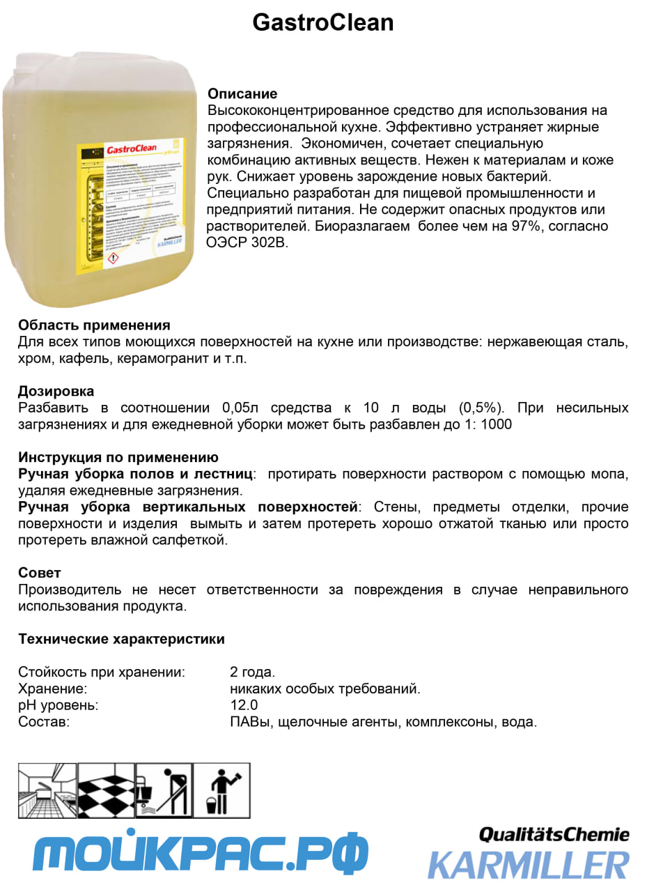 Высококонцентрированное средство для использования на профессиональной кухне. Эффективно устраняет жирные загрязнения. Экономичен, сочетает специальную комбинацию активных веществ. Нежен к материалам и коже рук. Снижает уровень зарождение новых бактерий. Специально разработан для пищевой промышленности и предприятий питания. Не содержит опасных продуктов или растворителей. Для всех типов моющихся поверхностей на кухне или производстве: нержавеющая сталь, хром, кафель, керамогранит и т.п. Дозировка Разбавить в соотношении 0,05 л. средства к 10 л. воды (0,5%). При несильных загрязнениях и для ежедневной уборки может быть разбавлен до 1: 1000 Продается в таре Объем: : 10 л/1л. Купить в г.Красноярске в магазине “Мойкрас.рф ВСЁ ДЛЯ КЛИНИНГА” 2ГИС: Индивидуальная скидка для подписчиков в Telegram.