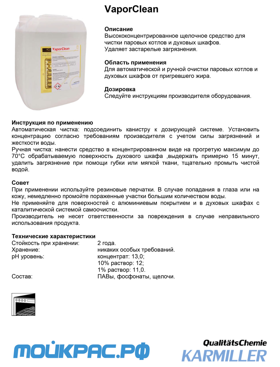 Высококонцентрированное щелочное средство для очистки паровых котлов и духовых шкафов. Удаляет застарелые загрязнения. Для автоматической и ручной очистки паровых котлов и духовых шкафов от пригревшего жира. Продается в таре Объем: : 10 л/1л. Ручная чистка: нанести средство в концентрированном виде на прогретую максимум до 70°C обрабатываемую поверхность духового шкафа ,выдержать примерно 15 минут, удалить загрязнение при помощи губки или мягкой ткани, тщательно промыть чистой водой. ❗️При применении используйте резиновые перчатки. ❗️В случае попадания в глаза или на кожу, немедленно промойте пораженные участки большим количеством воды. ❗️Следуйте инструкциям производителя оборудования. ❗️Не применяйте для поверхностей с алюминиевым покрытием и в духовых шкафах с каталитической системой самоочистки. Купить в г.Красноярске в магазине “Мойкрас.рф ВСЁ ДЛЯ КЛИНИНГА” 2ГИС: Индивидуальная скидка для подписчиков в Telegram.