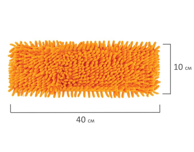 Моп имеет форму плоского прямоугольника, такая форма и чистящая поверхность из крупного ворса длиной 2 см позволяет удобно собрать грязь по углам и захватить большую площадь убираемой поверхности, что в свою очередь уменьшает временные затраты на уборку больших площадей. Устойчива к износу, что обеспечивает долгий срок службы уборочного инструмента. Выполнена из микрофибры и имеет размер 40х10 см. Максимальный объем впитывания – 400 мл.