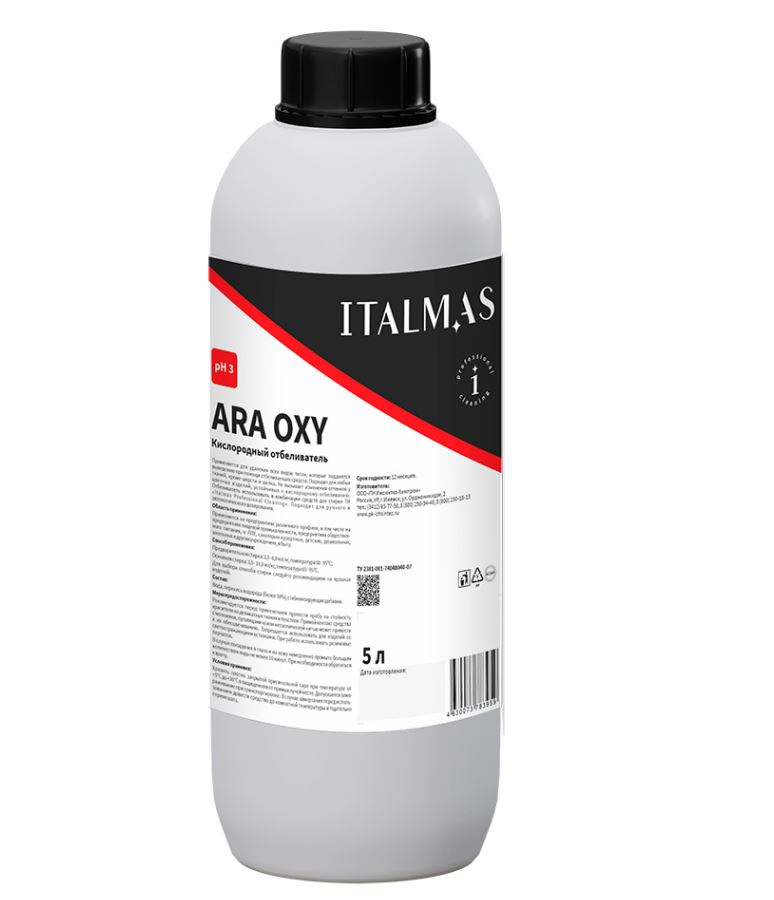 У нас можно купить профессиональный кислородный отбеливатель для стирки белья в прачечной ARA OXY. Если вам нужна на кислородный отбеливатель для прачечной ARA OXY оптовая цена, то присылайте вашу заявку. Область применения Применяется на предприятиях различного профиля, в том числе на предприятиях пищевой промышленности, предприятиях общественного питания, в ЛПУ, санаторно-курортных, детских, дошкольных, школьных и других учреждениях, в быту. Преимущества Применяется для удаления всех видов пятен, которые поддаются выведению при помощи отбеливающих средств. Подходит для любых тканей, кроме шерсти и шелка. Не вызывает изменения оттенков у цветных изделий, устойчивых к кислородному отбеливанию. Отбеливатель подходит для ручного и автоматического дозирования в прачечной. Рекомендуется использовать в комбинации средств для стирки LEO Expert и Ursa Expert. Дозировка Предварительная стирка: 3,0 – 6,0 мл/кг, температура 60 – 95ºС. Основная стирка: 3,0 – 10,0 мл/кг, температура 60 – 95ºС. Для выбора способа стирки следуйте рекомендациям на ярлыках изделий. Состав: вода, перекись водорода (более 30%), стабилизирующие добавки. ximiks.ru