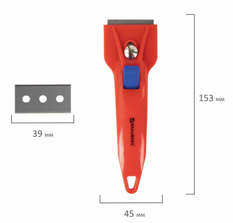 Скребок выполнен из прочного АBS пластика. Ширина лезвия – 39 мм, длина лезвия – 20 мм. Это идеальный помощник для бережного и эффективного удаления с плоских и гладких поверхностей (стекло, плитка, керамические плиты, ламинат и ламинированные поверхности) свежих или застарелых загрязнений от жира, смолы, жевательной резинки, битума или краски.