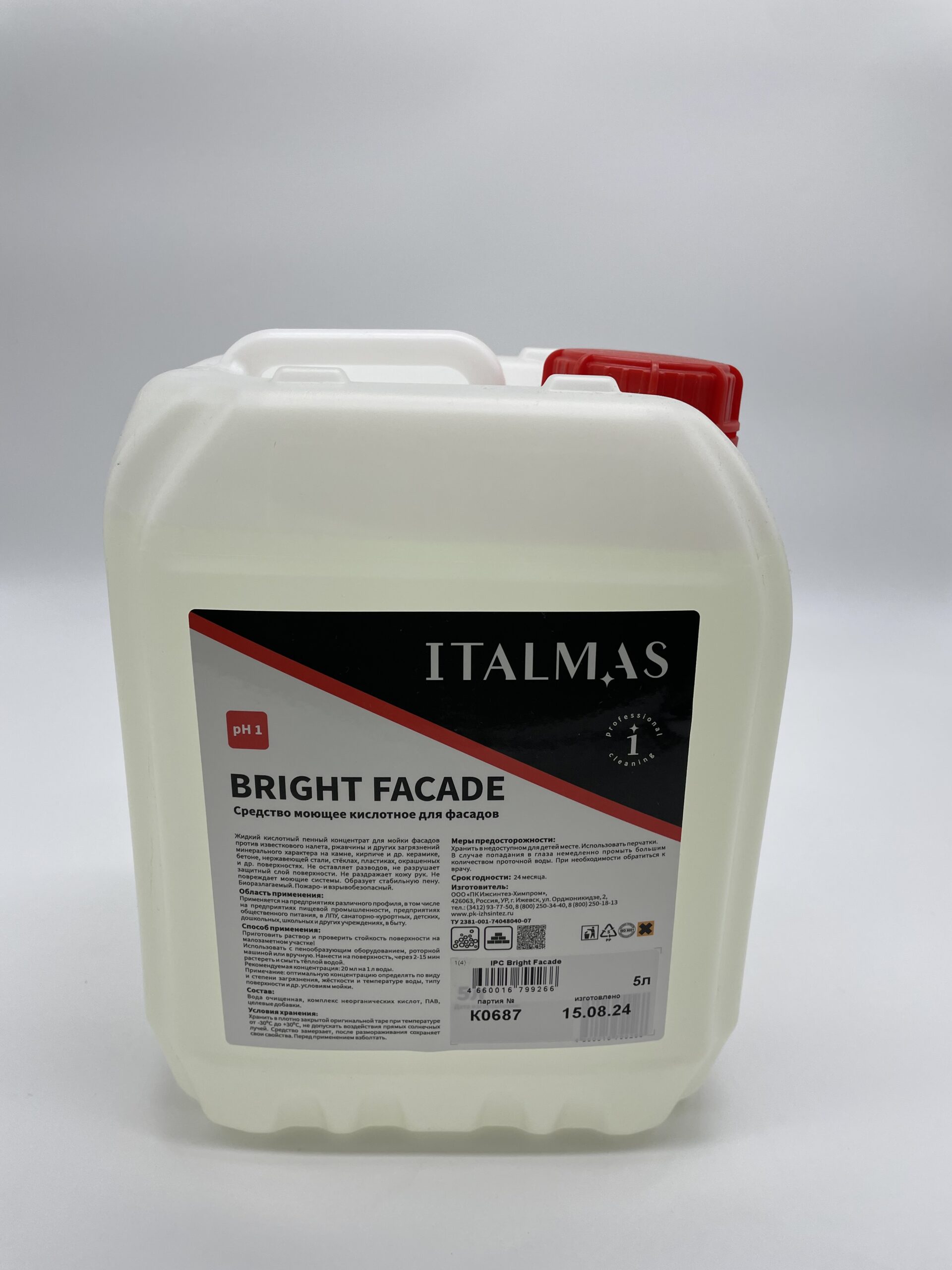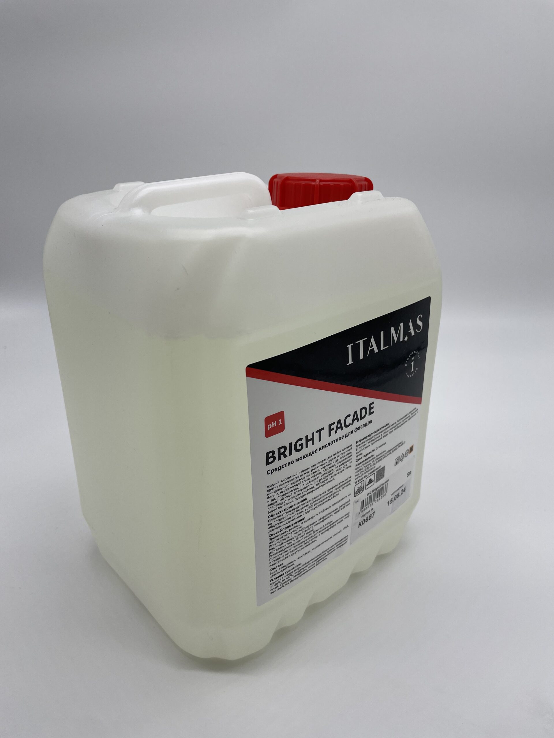 Жидкий кислотный пенный концентрат Bright Facade для мойки фасадов против известкового налета, ржавчины и других загрязнений минерального характера на камне, кирпиче и др. керамике, бетоне, нержавеющей стали, стёклах, пластиках, окрашенных и др. поверхностях. Не оставляет разводов, не разрушает защитный слой поверхности. Не раздражает кожу рук. Не повреждает моющие системы. Образует стабильную пену. Биоразлагаемый. Пожаро- и взрывобезопасный. Область применения: Применяется на предприятиях различного профиля, в том числе на предприятиях пищевой промышленности, предприятиях общественного питания, в ЛПУ, санаторно-курортных, детских, дошкольных, школьных и других учреждениях, в быту. Способ применения: Приготовить раствор. Использовать с пенообразующим оборудованием, роторной машиной или вручную. Нанести на поверхность, через 2-15 мин растереть и смыть тёплой водой. Рекомендуемая концентрация: 20 мл на 1 л воды. Примечание: оптимальную концентрацию определять по виду и степени загрязнения, жёсткости и температуре воды, типу поверхности и др. условиям мойки. Состав: Комплекс неорганических кислот, ПАВ, целевые добавки, вода очищенная. Плотность: 1,260-1,285 г/мл. pH: 1 Условия хранения: Средство замерзает, после размораживания сохраняет свои свойства. Перед применением взболтать. Хранить в плотно закрытой оригинальной таре при температуре -30°С до +30°С, не допускать воздействия прямых солнечных лучей. Меры предосторожности: Хранить в недоступном для детей месте. Использовать перчатки. В случае попадания в глаза немедленно промыть большим количеством проточной воды. При необходимости обратиться к врачу. Класс опасности: 3 класс умеренно-опасных веществ при попадании в желудок, 2 класс высокоопасных веществ при ингаляционном воздействии (в форме аэрозоля и паров), в виде концентрата обладает выраженным местно-раздражающим действием на кожу (вызывает ожоги и воспалительные заболевания) и слизистые оболочки глаз (повреждает роговицу), не обладает сенсибилизирующим действием, рабочие вызывают раздражения кожи при многократных повторных аппликациях.