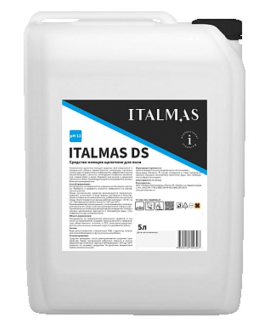 Низкопенное щелочное моющее средство Italmas DS для ежедневной и генеральной уборки керамогранита, линолеума, наливных полов и других водостойких поверхностей. Эффективно против масляножировых, сажистых, атмосферно-почвенных загрязнений, следов обуви и колес. Подходит для ручной и машинной технологии мойки. Рекомендуется для использования в местах с большой проходимостью.