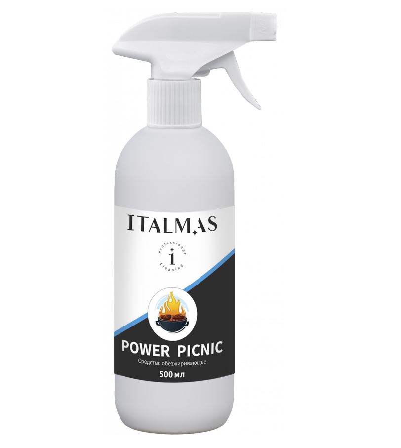 Средство обезжиривающее POWER PICNIC 500 мл с пенным дозатором (усиленная формула). Эффективное высокощелочное средство для удаления жира, нагара и копоти с различных поверхностей, в том числе с плит, коптильных камер, грилей, духовых шкафов, посуды, кухонных принадлежностей и др. Имеет в составе активные компоненты, которые эффективно воздействуют на застарелые и интенсивные загрязнения. Способ применения: Средство готово к применению. Необходимо нанести средство на очищаемую поверхность и оставить на несколько секунд. Далее протереть губкой или щеткой и смыть водой. При интенсивных загрязнениях обработку необходимо повторить. pH 13