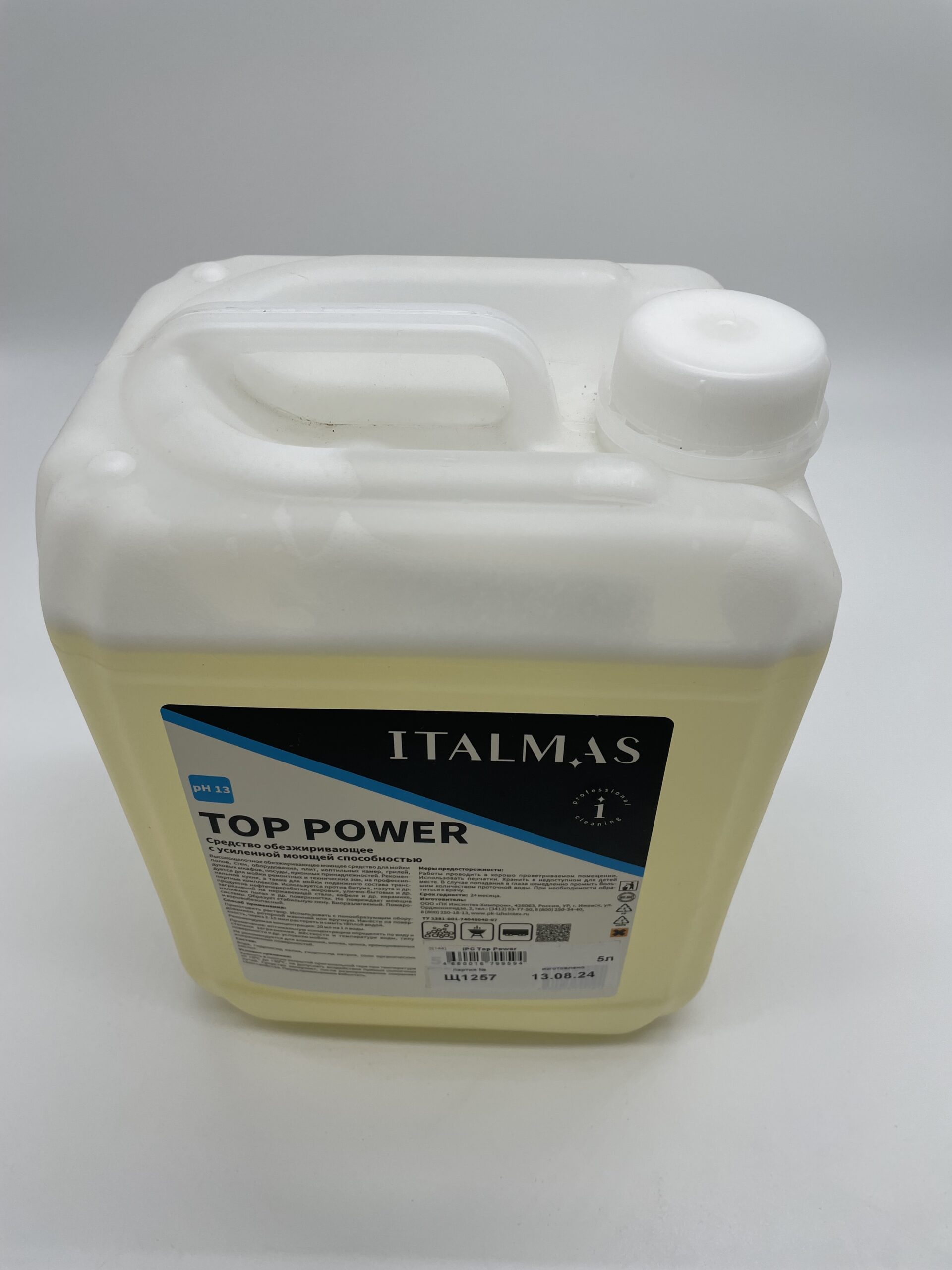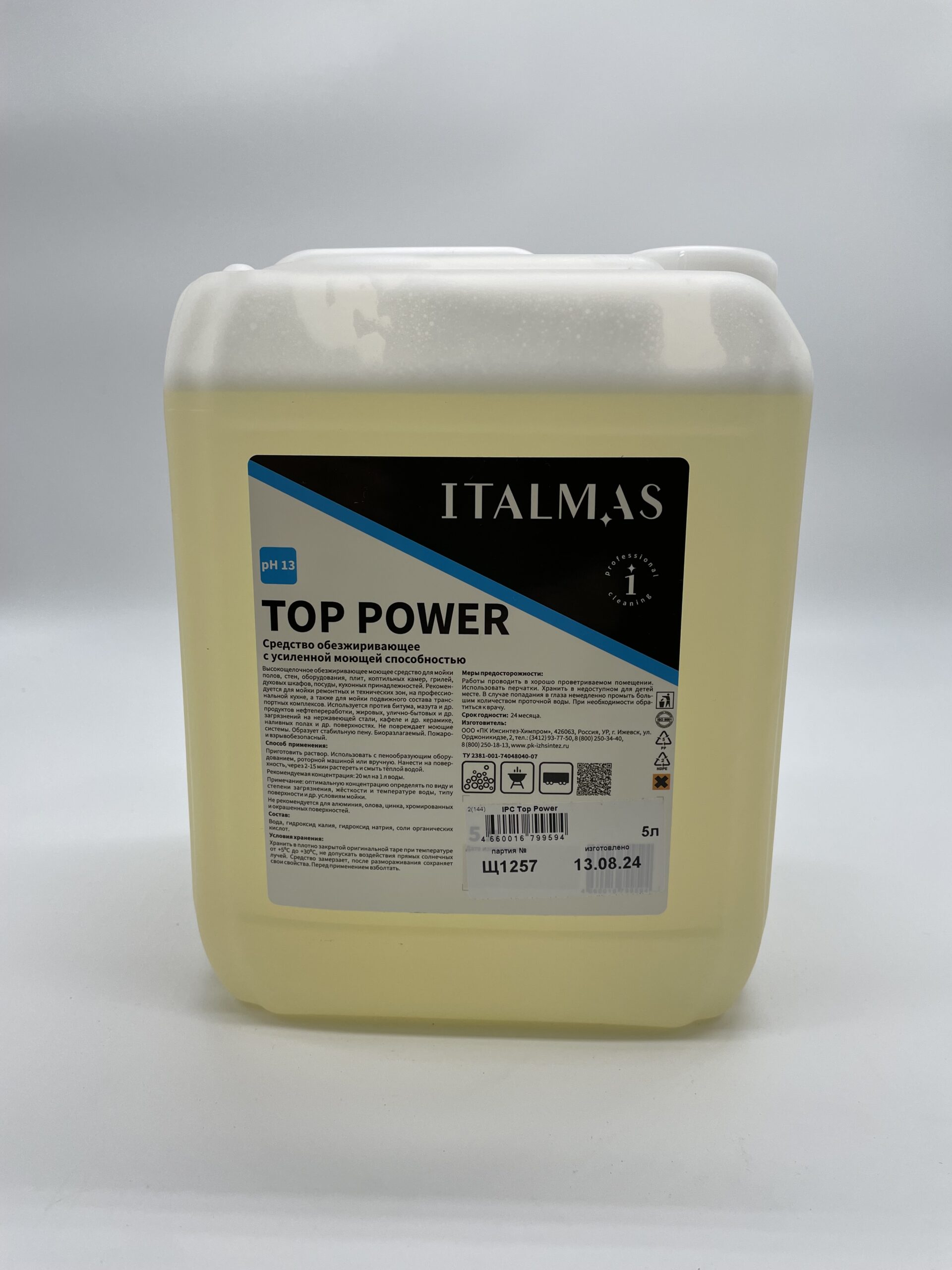 Высокощелочное обезжиривающее моющее средство ИжСинтез Top Power для мойки полов, стен, оборудования, плит, коптильных камер, грилей, духовых шкафов, посуды, кухонных принадлежностей. Рекомендуется для мойки ремонтных и технических зон, на профессиональной кухне, а также для мойки подвижного состава транспортных комплексов. Используется против битума, мазута и др. продуктов нефтепереработки, жировых, улично-бытовых и др. загрязнений на нержавеющей стали, кафеле и др. керамике, наливных полах и др. поверхностях. Не повреждает моющие системы. Образует стабильную пену. Биоразлагаемый. Пожаро- и взрывобезопасный. Область применения: Применяется на предприятиях различного профиля, в том числе на предприятиях пищевой промышленности, предприятиях общественного питания, в ЛПУ, санаторно-курортных, детских, дошкольных, школьных и других учреждениях, в быту. Способ применения: Приготовить раствор. Температурный режим мойки 20-60°С. Использовать с пенообразующим оборудованием, роторной машиной или вручную. Нанести на поверхность, через 2-15 мин растереть и смыть тёплой водой. Рекомендуемая концентрация: 20 мл на 1 л воды. Примечание: оптимальную концентрацию определять по виду и степени загрязнения, жёсткости и температуре воды, типу поверхности и др. условиям мойки. Не рекомендуется для алюминия, олова, цинка, хромированных и окрашенных поверхностей. Состав: Гидроксид калия, гидроксид натрия, соли органических кислот, вода. Плотность: 1,35-1,40 г/мл. pH: 13 Условия хранения: Средство замерзает, после размораживания сохраняет свои свойства. Перед применением взболтать. Хранить в плотно закрытой оригинальной таре при температуре +5°С до +30°С, не допускать воздействия прямых солнечных лучей. Меры предосторожности: Работы проводить в хорошо проветриваемом помещении. Использовать перчатки. Хранить в недоступном для детей месте. В случае попадания в глаза немедленно промыть большим количеством проточной воды. При необходимости обратиться к врачу. Класс опасности: 3 класс умеренно-опасных веществ при попадании в желудок и 4 класс малоопасных – при нанесении на кожу. Срок годности: 24 месяца. Упаковка: 5л